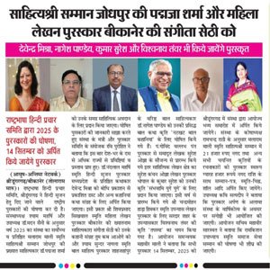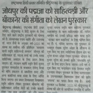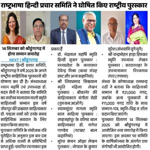 मौलिक महिला लेखन और सामाजिक सरोकारों से जुड़े कार्यो को प्रोत्साहित करने के लिए राष्ट्रभाषा हिन्दी प्रचार समिति, श्रीडूंगरगढ द्वारा वर्ष 2021 प्रारम्भ किए गये पुरस्कार व सम्मान की घोषणा कर दी गई है। आधी दुनिया के रूप में ख्यात महिला वर्ग में साहित्य के प्रोत्साहन और गरीब, बेसहारा, जरूरतमंद तबके के कल्याण हेतु सामाजिक सरोंकारों को समर्पित व्यक्तित्व की समाज सेवा को मान देने हेतु संस्था के दिवंगत पदाधिकारियों की स्मृति में इस वर्ष 2021 से प्रारम्भ किए गया